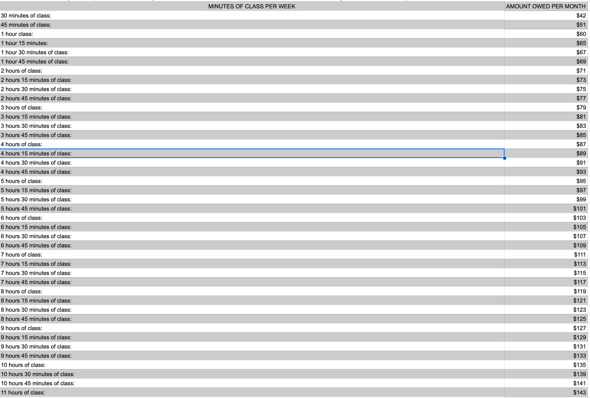Class time is the total amount of class time added up per week the student is in class(es). EXAMPLE: Jazz 30 Minutes + Tap 30 Minutes = 60 Minutes of class, therefore you would owe $60 per month.